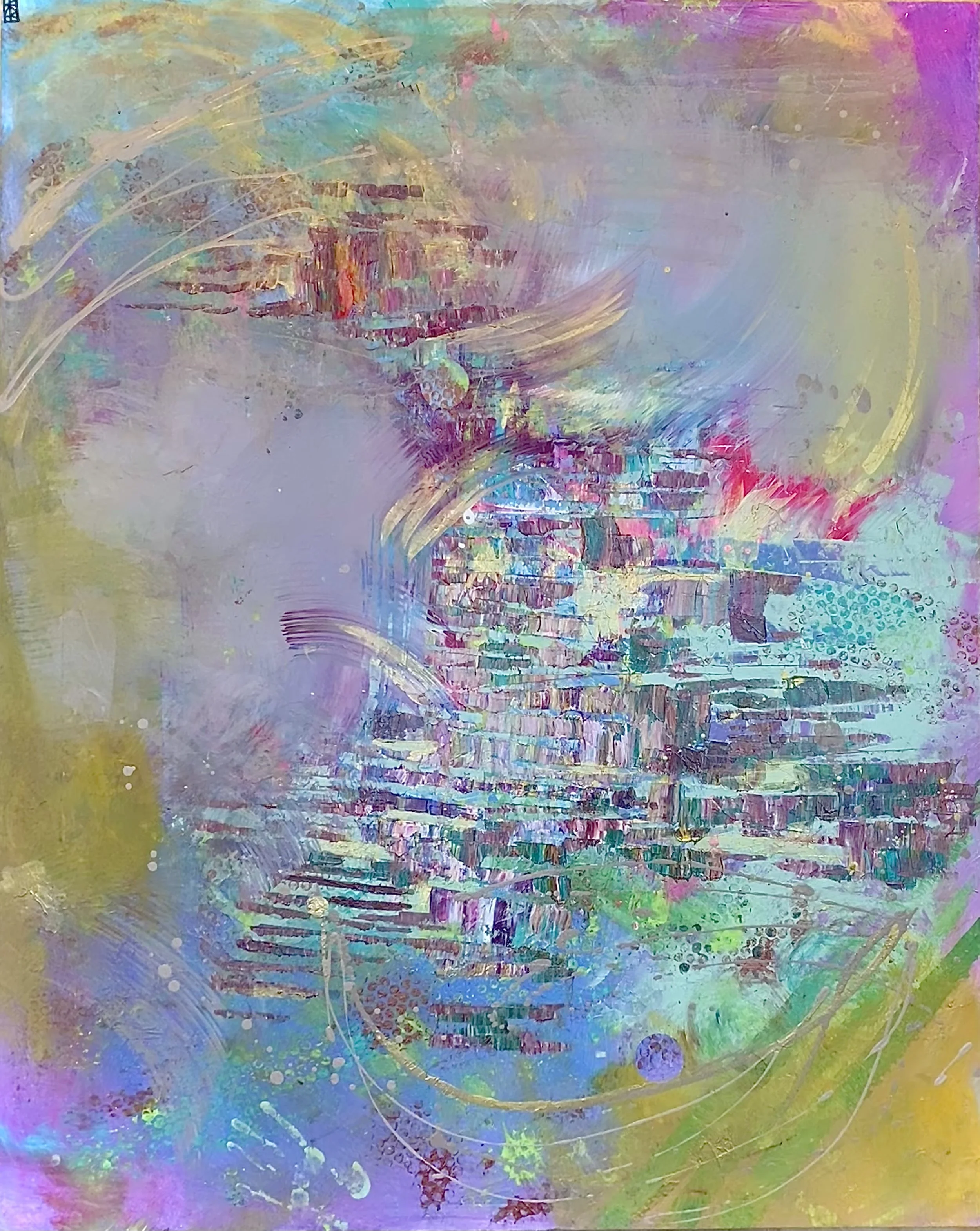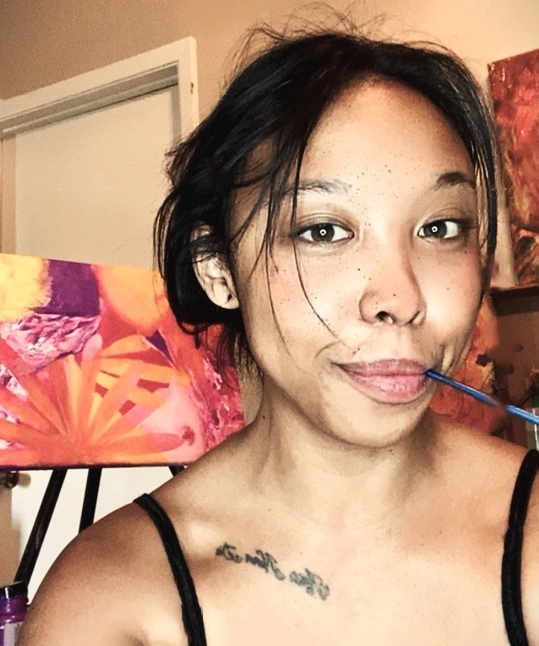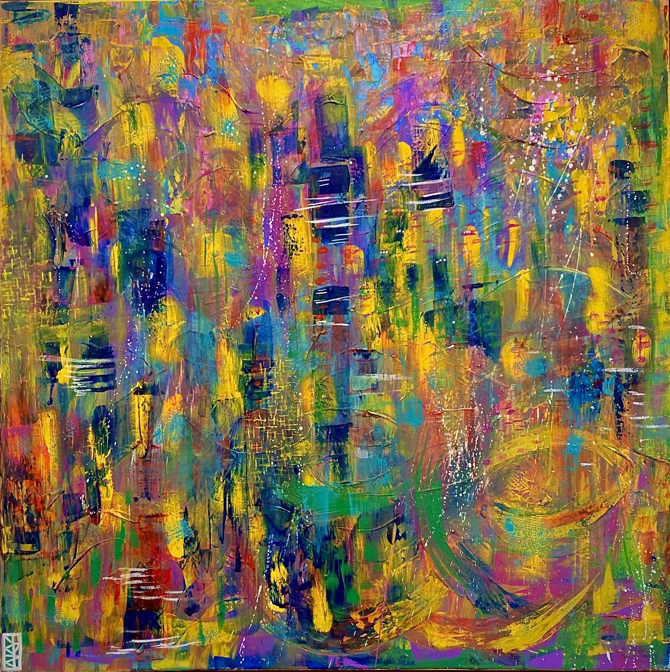 “My work is born from the energy of experiences that words cannot fully capture. Drawing from the depths of childhood and relationship trauma, I paint to release, process, and translate emotions into something tangible. My practice is intuitive; I don’t plan my pieces. Instead, I let each day’s feelings guide my hand, choosing colors, shapes, patterns, and strokes that resonate with me in the moment.